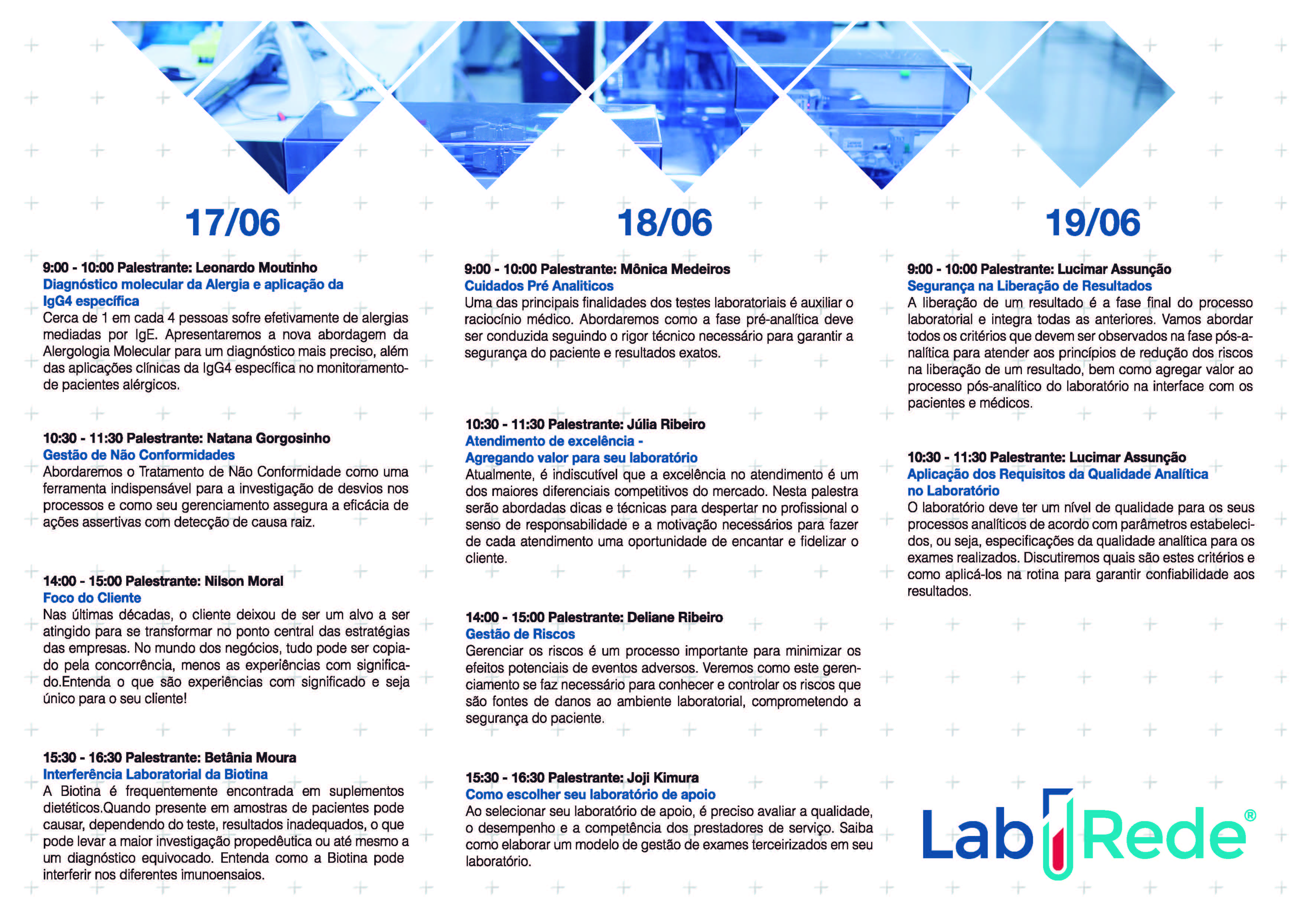 O Lab Rede estará presente na 46º edição do Congresso Brasileiro de Análises Clínicas que será realizado entre os dias 17,18 e 19 de junho em Belo Horizonte. Confira a programação de palestras gratuitas que estaremos oferecendo a você durante o evento. As vagas são limitadas. Acesse o link https://forms.gle/gqdVbFCou1sinmJF6 e faça sua inscrição.